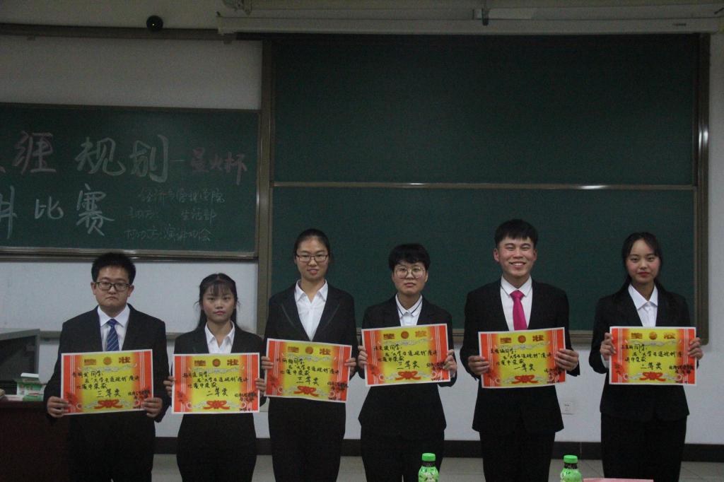 在经过激烈角逐之后,最终吴晓涵同学荣获一等奖,王秀丽、杨月涯同学获得二等奖,刘炳楠、乔明发、洪灵捷同学分别获得三等奖。评委们为获奖选手颁发了奖品并合影留念。至此,大学生涯规划演讲比赛虽然已经正式落下帷幕,但是他们的大学生活刚刚开始。