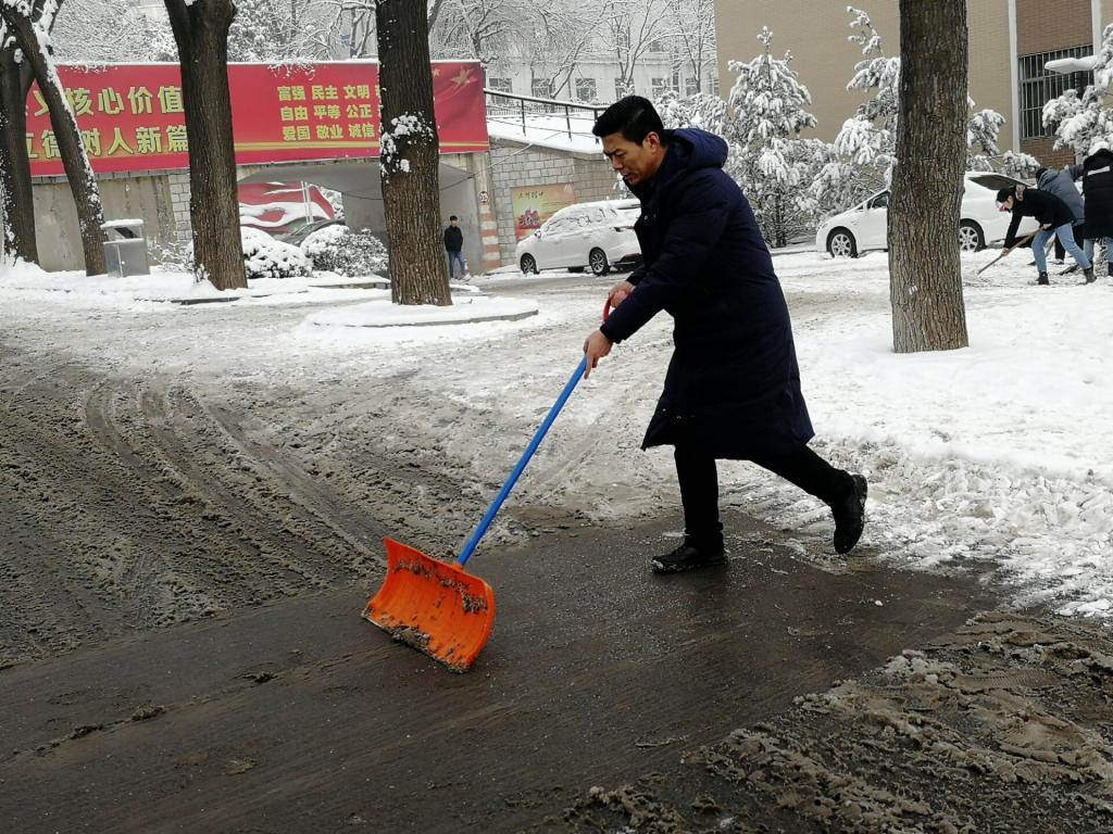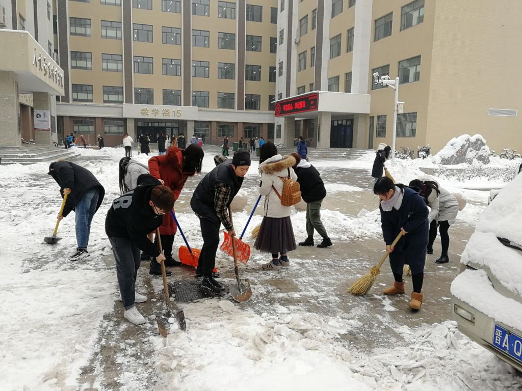 2020年1月5日,太原迎来初年的第一场降雪。为保障校区安全,方便交通出行,减少安全隐患,1月6日上午9:30,黄金城hjc999党委组织学院党员开展“清扫校园积雪,创设美好坏境”主题党日活动,院党委书记王琳、团委书记那鹏飞来到现场和同学一起参与此次活动。