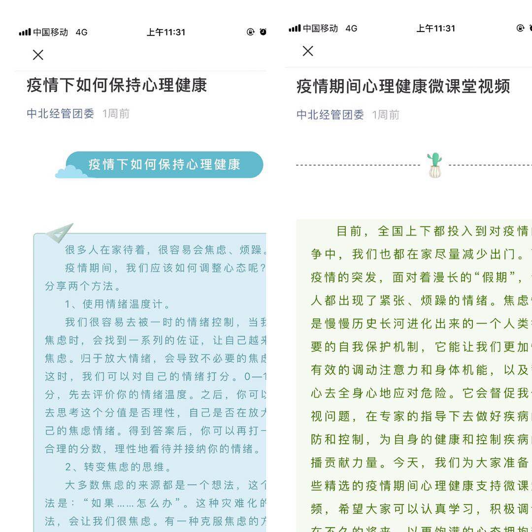 1.知识普及 为了让每个同学掌握一定的心理健康知识,并能在疫情期间自我检查,关心他人,保证学生在家的心理状态。学院通过微信公众号平台定期推送疫情期间心理健康知识。