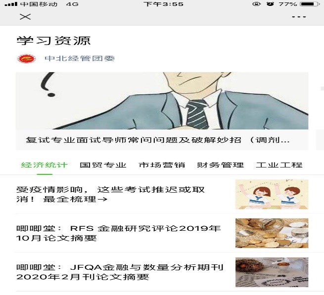 为响应“停课不停学”号召,我院在院团委公众号开设“学习资源”专栏,根据学院目前的5个专业,经济统计学、国际商务与贸易、市场营销、财务管理以及工业工程分别设置板块,每周对各个专业的相关专业知识进行推送,丰富学生的专业知识。