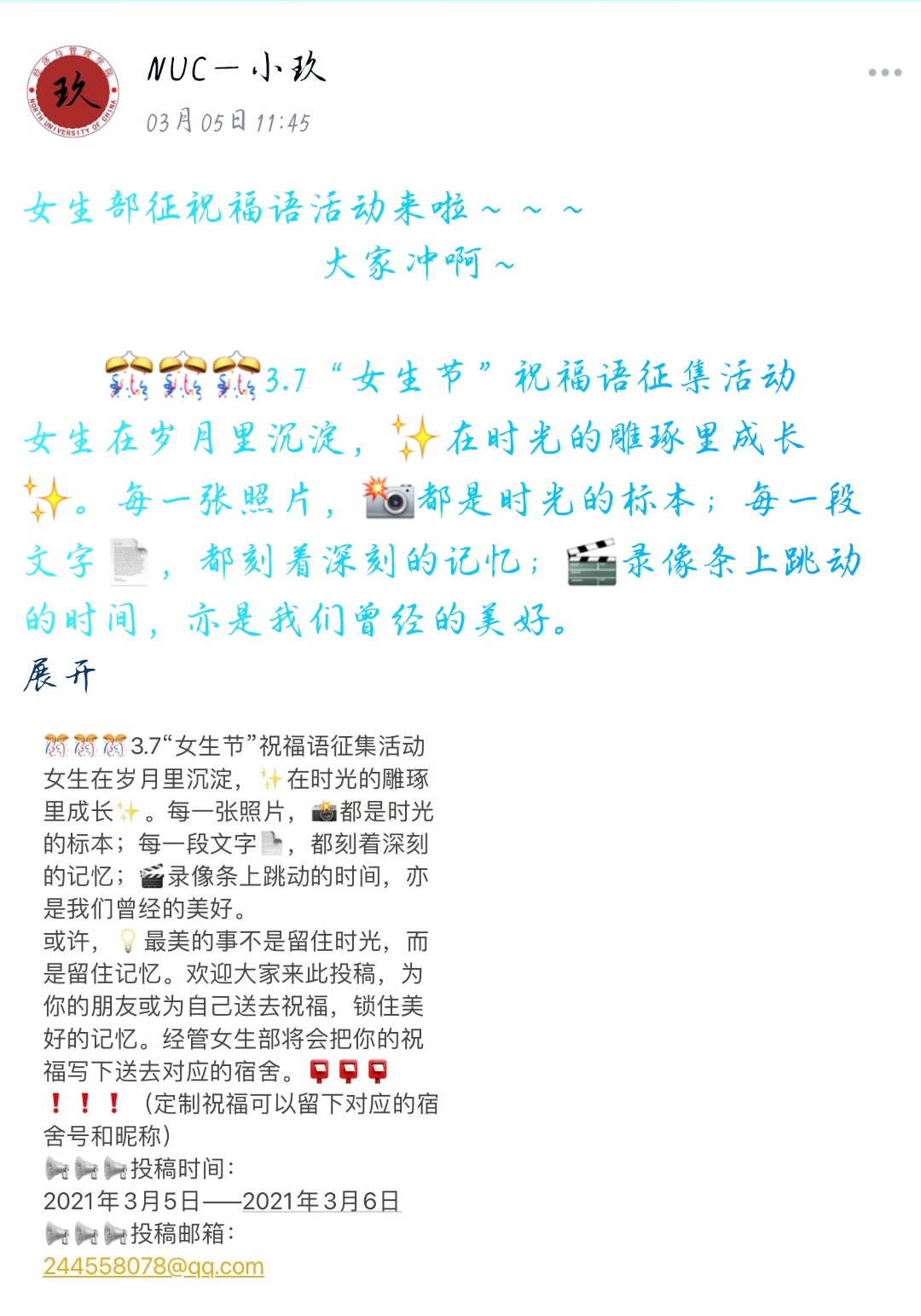 本次活动属于全校性质。活动开始前,我院女生部在校园学院官方QQ账号“NUC-小玖”上发表了有关女生节祝福语征集活动的通知,希望同学们能将自己对各位女生的祝福写下来。随后,女生部工作人员将祝福誊写到祝福卡片上,并于女生节当天送到每一个女生宿舍。活动通知一经发出,同学们积极响应,纷纷参与其中。