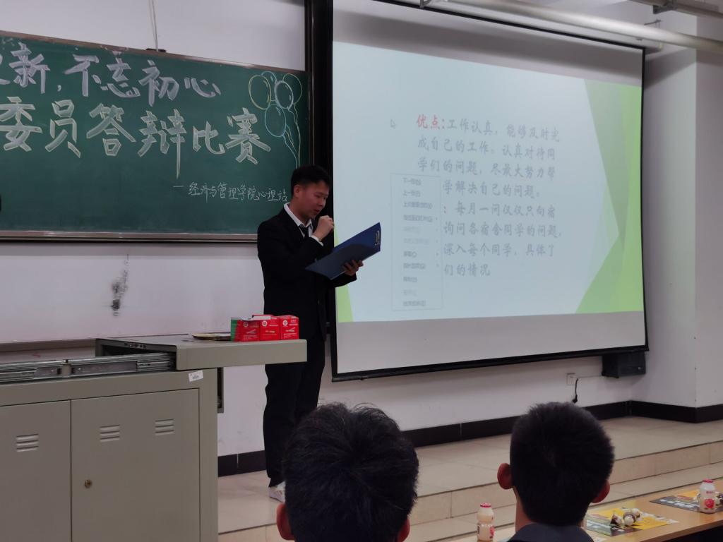 当日下午五点,心理站全体成员到场集合,准备好活动所需物品并且提前布置好现场,同时,各班心理委员也进行汇报前的最后确认。7点整,答辩比赛正式开始。各班心理委员围绕“上学期工作总结和本学期工作计划”这一主题以PPT的形式向评委和同学们展示了各班级的活动情况,展现了积极向上的精神风貌。答辩完毕后,场内进行心理知识趣味答题环节,现场同学积极参加,效果良好。最后,评委们分别对各心理委员的答辩PPT内容、举止动作以及精神风貌进行点评,希望选手们能够在答辩中得到成长。最终,20090402班兰智扬同学获得一等奖、20090406班李聪慧同学获得二等奖、20090408班李晓璇同学获得三等奖。