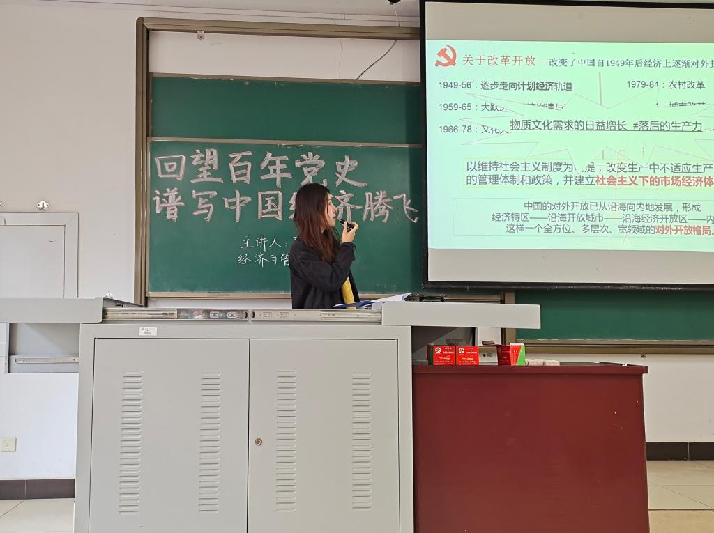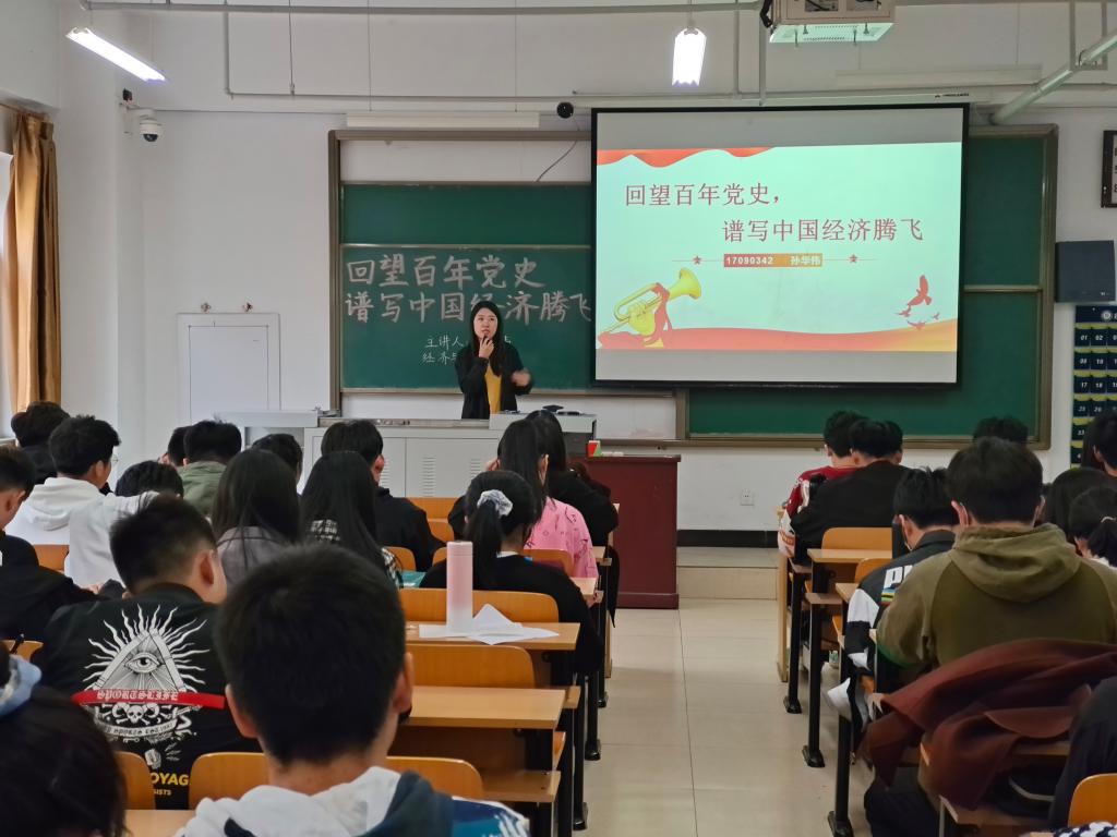 16:10宣讲活动正式开始。孙华伟同学带领大家回顾了中国共产党领导下取得的经济辉煌,重温了不同历史时期我国经济的发展状况,分享了我国经济不断崛起的艰苦历程,从百年党史中追寻真理和信仰,激励广大青年学生为谱写中华民族伟大复兴的新赞歌注入青春力量。