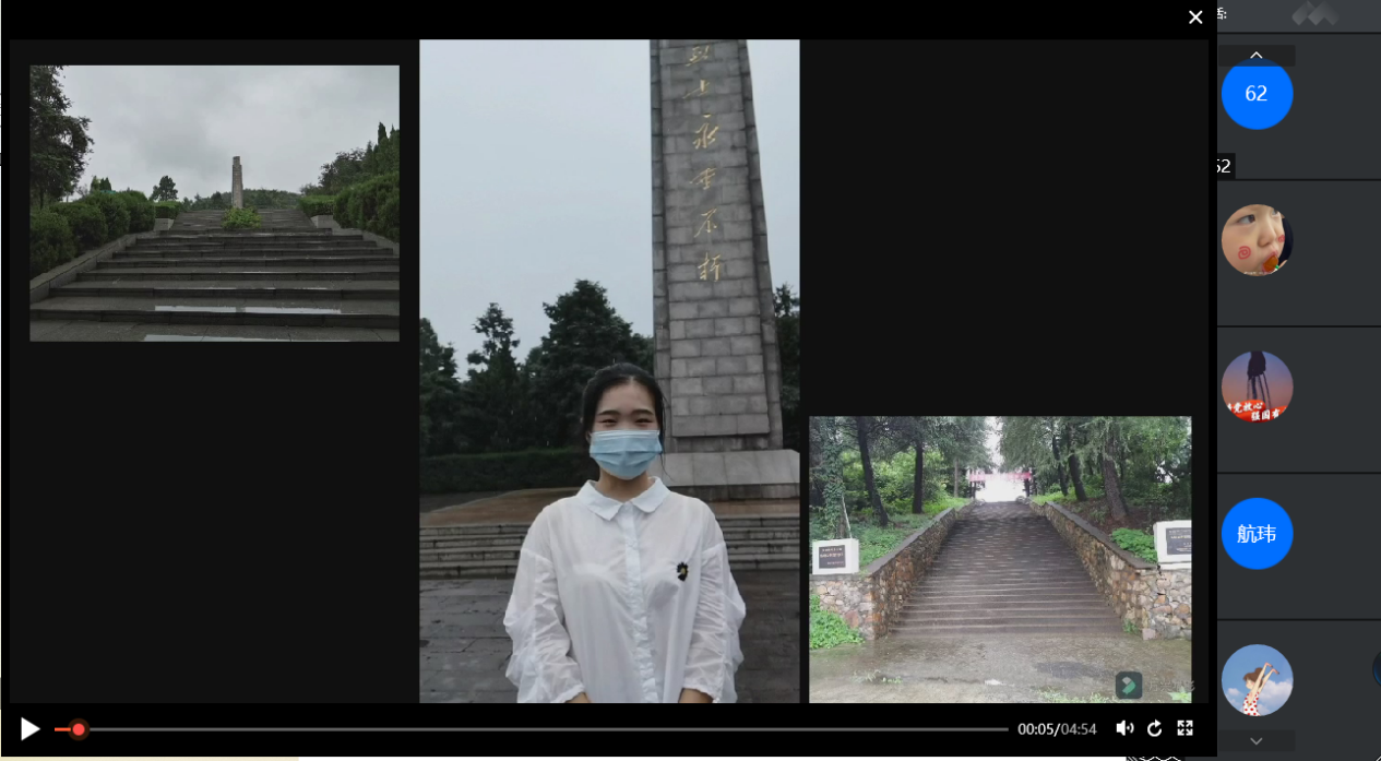 抵达烈士陵园,沿着长长的阶梯向上便能够看到一座高高矗立着的纪念碑,这座纪念碑的修建是为了纪念在渡江战役中牺牲的39位无名烈士。注视着纪念碑、遥想着烈士们当年献身救国的豪情万丈和慷慨激昂。陵园内的革命历史纪念馆陈列着抗日战争时期、解放战争时期的革命烈士英名录、烈士遗物、革命时期的图片、革命斗争史及重大历史事件介绍等。现园区共有烈士墓32座,红军墓18座,纪念碑2座,纪念亭2座,纪念馆1处。实践团团员们跟随孙娜同学,隔着屏幕注视着庄严的墓碑,感受战争所带来的悲痛、体会战士们英勇无畏、保家卫国的决心。