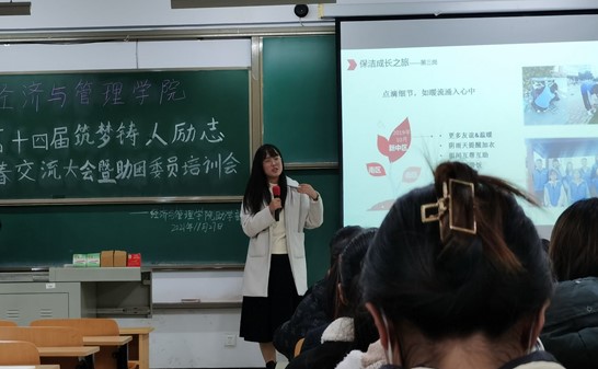 大会首先由刘鸿老师就我院各类助学政策进行了详细的说明,使同学们了解了各项政策并如何维护自己的权益。大会第二项观看有关勤工助学的视频,使大家更深入的了解勤工助学部各项工作。随后胡悦学姐和徐泽鹏学姐为我们交流她们的学习经验。胡悦学姐向大家讲述了她大学三年的各种经验。她讲到:“在大学,我们依然要努力学习,只有自己努力学习,才是不枉在大学的四年时光。另外,在学习之余,我们要尽自己最大的能力去多参加比赛,在比赛中锻炼自己的实践能力。”徐泽鹏学姐为我们讲述了她勤工助学的经历,她竞选队长过程中,经历了几次失败,但是她没有气馁,依然继续努力,最后多次在勤工助学中都是队长。徐泽鹏学姐的经历告诉我们,做什么事都不能半途而废,我们要迎难而上才能成功。