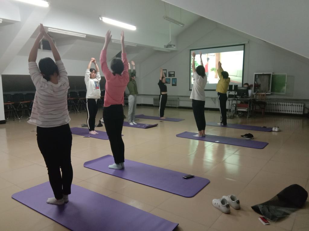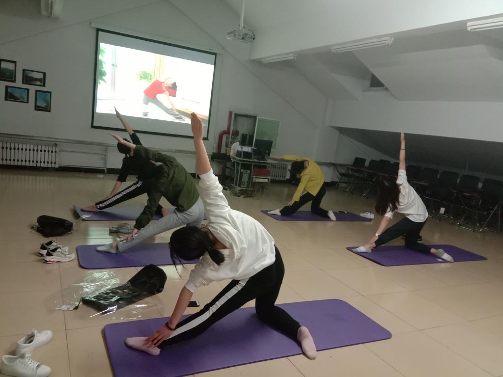 第一批体验瑜伽运动的我院学生纷纷跟随视频教学节奏、不断调整动作、全力舒展身体、均匀调整呼吸以达身心合一。现场气氛安逸和谐,在场学生通过持戒、精进、体位、调息等动作,将瑜伽魅力展现得淋漓尽致。