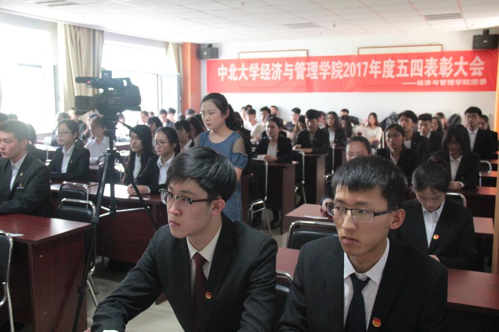 伴随着雄壮的团歌声,大会正式开始。首先,由我院党委书记王琳致辞。王书记总结了我院一年以来团建工作取得的成就,提出"稳中求进、敢于创新"的发展蓝图,并提出大学生应当具备"坚定信念、勤奋学习、自信自强"三大素质,孜孜以求,奋发有为。随后,我院党委副书记屈有明宣读了我院校级先进个人名单,学生科科长李爱霞公布我院团内先进集体及个人的表彰决定。校级优秀团员赵璞同学、优秀运动员杨倩同学先后上台发言,向同学们发出了“不负使命,筑梦经管”的号召。