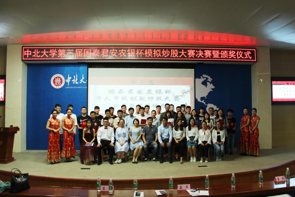 5月29日下午3点,中北大学第三届国泰君安农银杯牛人牛股模拟炒股大赛决赛暨颁奖仪式在瑾瑜国际会议中心举行。校团委副书记刘玉巍、黄金城hjc999党委副书记屈有明、团委书记那鹏飞、经济学学科部副主任周娟美、国泰君安并州北路营业部总经理刘泽、部门经理张涵以及我院部分团委学生会干部出席了本次活动。