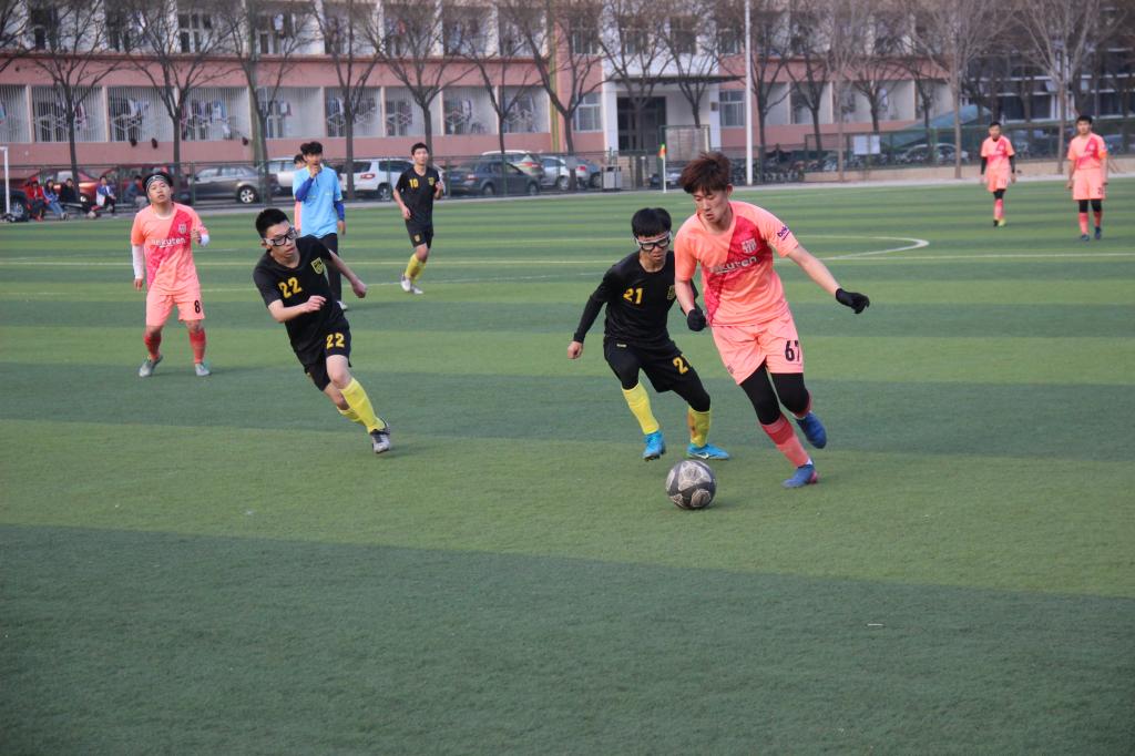 随着裁判一声哨响,上半场比赛正式开始。三院首先开球,并在开场就展开猛烈攻势,展现出不凡的实力。但我院队员也不容小觑,迅速调整状态,积极改变防守策略,以攻为守,占据场上的控球优势,带动比赛的节奏,队友之间相互配合,连续几脚迅猛打门,但都射出场外或被对方守门员扑救成功。双方持于胶着状态,双方队员始终积极跑动,寻找空档。我方及时抓住对方队员身后空挡,找准时机,中场队员迅速将球过渡给20号张彧飞,张彧飞随即拔脚直射,足球贴地直入死角,我方成功先得一分。材料院队员连调策略,防守得当,比赛再次陷入了焦灼。39号杨超抓住对方防守球员巨大失误,再入一球,比分来到了2:0。比赛进入白热化阶段,下半场对方对我方禁区持续压迫进攻,终于利用我方门将失误,靠一次任意球扳回一球。随着终场哨音的响起,比分定格在了2:1,我院取得了比赛的胜利。